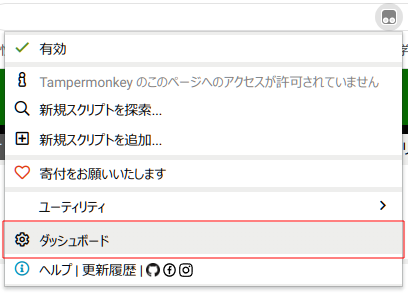次に拡張機能アイコンから tampermonkey のダッシュボードを開きます。